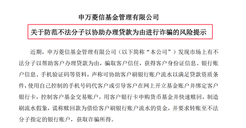 一是以協(xié)助辦理貸款為由進行詐騙。申萬菱信基金1月18日公告顯示,不法分子以幫助客戶辦理貸款為由,騙取客戶信任,獲得客戶身份證信息、銀行賬戶信息、手機驗證碼等資料,聲稱可協(xié)助客戶刷銀行賬戶流水以滿足貸款資質(zhì)條件,使用自己控制的手機號碼代客戶或引導(dǎo)客戶在網(wǎng)上開立基金賬戶并綁定客戶銀行卡,控制客戶基金交易賬戶,用客戶銀行卡申購貨幣基金并快速贖回,制造刷流水假象,謊稱贖回款為借給客戶刷銀行賬戶流水的資金,并要求轉(zhuǎn)賬至不法分子指定的銀行賬戶,獲取詐騙所得。