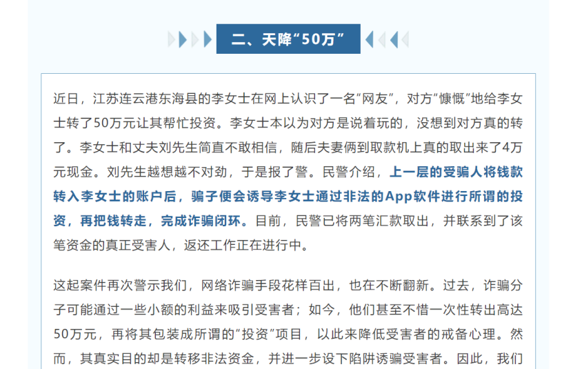 以天降“50萬”案例為例,諾安基金《文章》顯示,江蘇連云港東海縣的李女士在網(wǎng)上認識了一名“網(wǎng)友”,對方“慷慨”地給李女士轉(zhuǎn)了50萬元讓其幫忙投資。李女士本以為對方是說著玩的,沒想到對方真的轉(zhuǎn)了。李女士和丈夫劉先生簡直不敢相信,隨后夫妻倆到取款機上真的取出來了4萬元現(xiàn)金。劉先生越想越不對勁,于是報了警。民警介紹,上一層的受騙人將錢款轉(zhuǎn)入李女士的賬戶后,騙子便會誘導(dǎo)李女士通過非法的App軟件進行所謂的投資,再把錢轉(zhuǎn)走,完成詐騙閉環(huán)。
